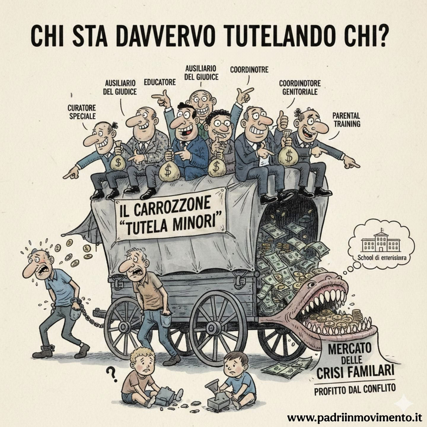 In nome della tanto invocata “tutela dei minori”, si è progressivamente costruito attorno ai bambini e ai loro genitori un vero e proprio carrozzone di figure a pagamento: curatori speciali, ausiliari del giudice, educatori, psicologi, coordinatori genitoriali, percorsi di parental training e un’infinità di altri interventi. Un apparato mastodontico, quasi sempre interamente a carico dei genitori — e troppo spesso sulle spalle di quello già più fragile, marginalizzato o alienato.